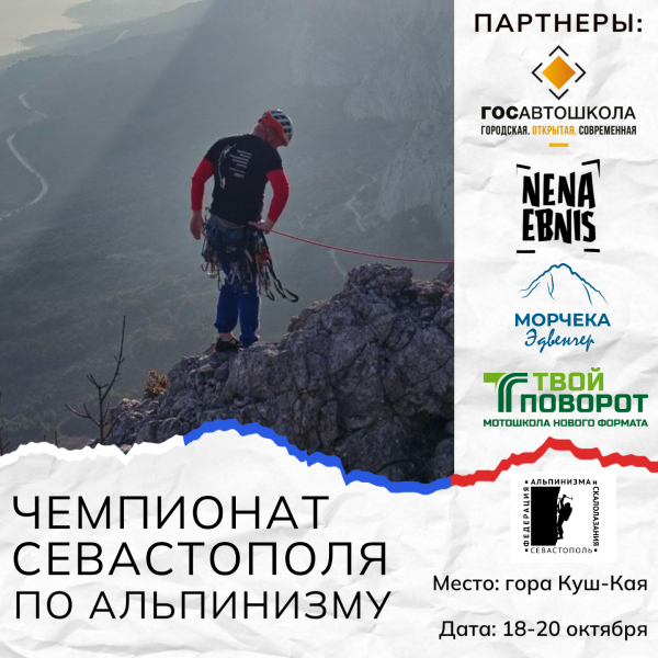 Федерация альпинизма и скалолазания г. Севастополя приглашает 18-20 октября принять участие в Чемпионате города Севастополя по альпинизму (класс - скальный). Формат: первый день – "Школа" (урочище Батилиман, гора Куш-Кая), второй день – "Восхождения". Соревнования проводятся среди спортсменов города Севастополя: мужчин и женщин старше 18 лет. РЕГЛАМЕНТ СОРЕВНОВАНИЙ В ПРИЛОЖЕНИИ.