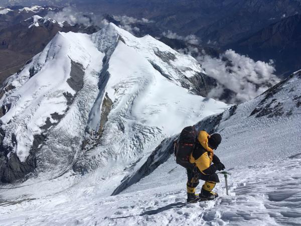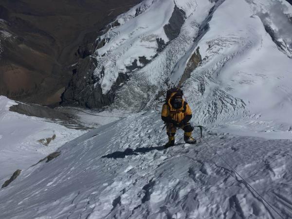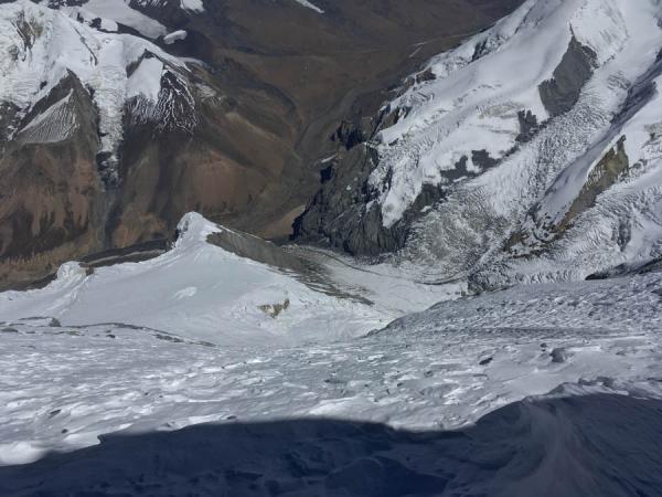 13 сентября: наша команда вышла наверх, планируются 3 ночевки наверху и установка высотных лагерей — по прогнозу через 3 дня начнется сильный снегопад, как раз до него команда должна спуститься в базовый лагерь. Поставлен лагерь 1 на высоте 5650 м. Идти сложно: много снега и, так как экспедиций на эту гору мало, то тропы не протоптаны, перила нигде не провешены, ребята все делают сами, на это уходит время. Юра сказал: «как в настоящем альпинизме»