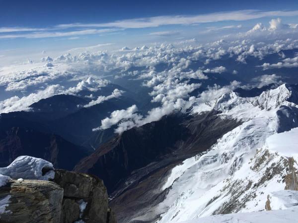 Восходители, как и планировали, вышли в 9 вечера 30.09 из лагеря 3 (около 7200м). Юра сообщил, что маршрут оказался сложнее, чем ожидали: не везде можно было пройти пешком, на высоте около 8 тыс.м пришлось лезть по ледяной стене с двумя ледорубами. В 8:30 утра (через 11.5 часов после выхода из лагеря 3) Юра и Пурба вышли на вершину! В этот день больше ни одна экспедиция не пошла на вершины других высочайших гор, поэтому Юра и Пурба стояли на земле выше всех во всем мире! (Самолеты не в счет:)